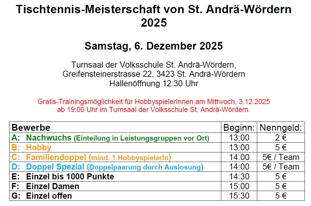 Wir führen am Samstag, den 6. Dezember 2024 ab 13:00 Uhr im Turnsaal der Volksschule St. Andrä-Wördern, unser traditionelles Tischtennisturnier durch.
